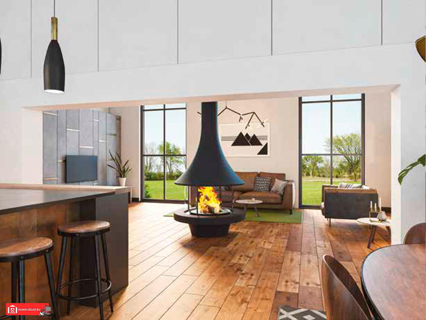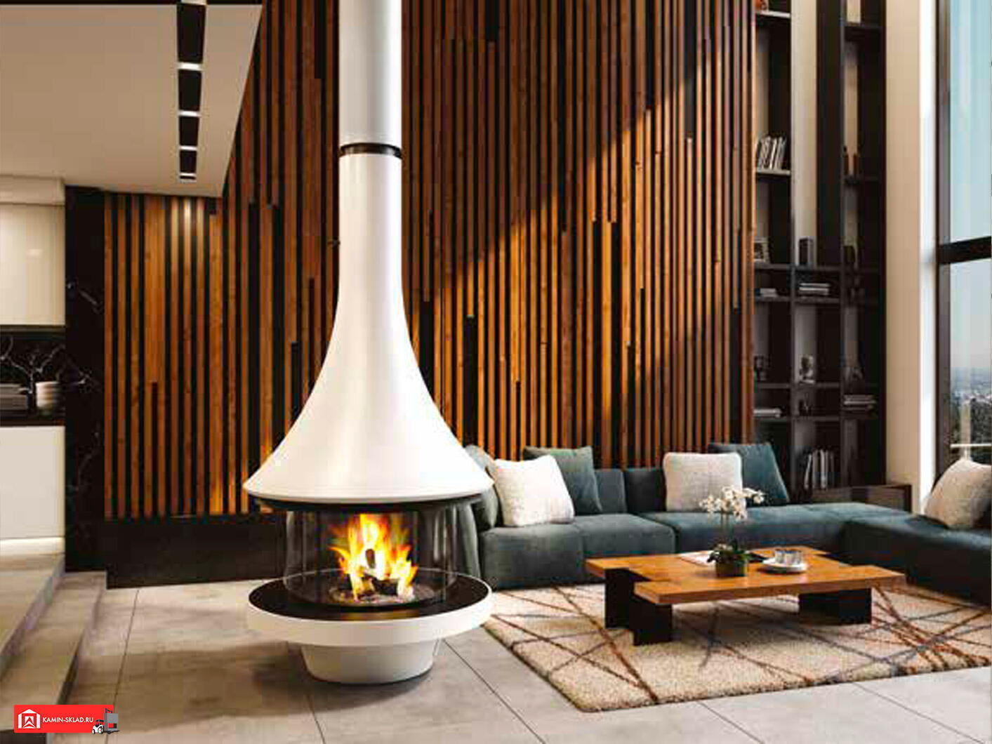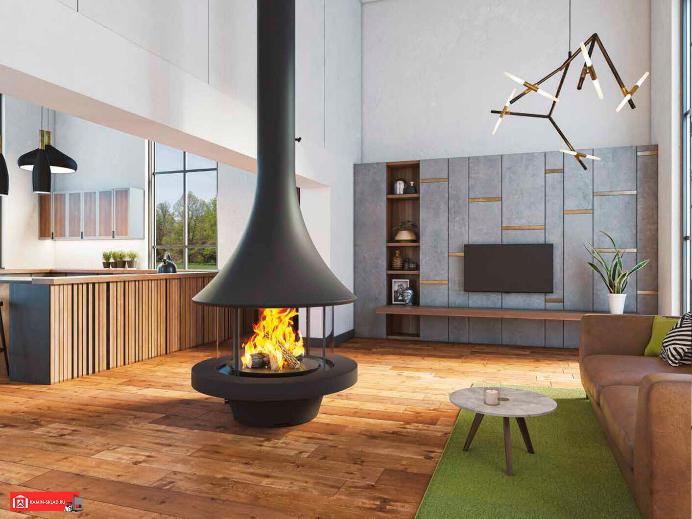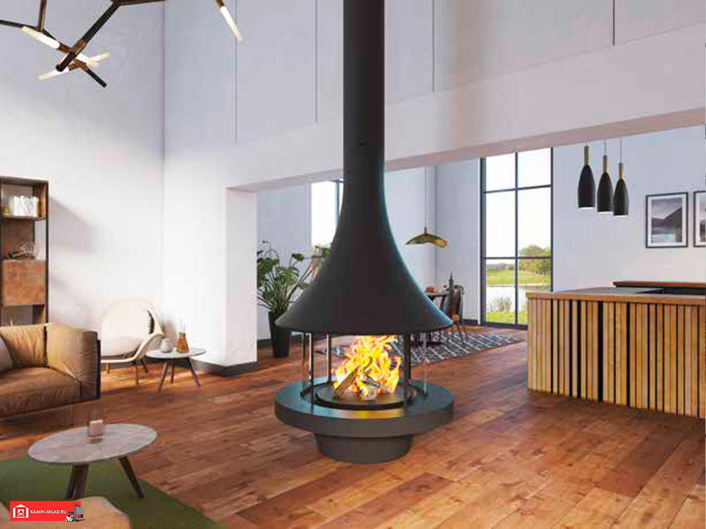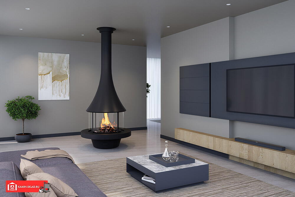 Дровяной камин EVA 992 центральный со стеклом и стандартным основанием