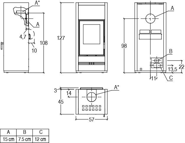 Высота, см 127 Ширина, см 57 Глубина, см 45 Мощность, кВт 5,5 - 11 Форма стекла Прямое Материал Сталь+Чугун+Керамика Диаметр дымохода, мм 150 Вес, кг 208 Духовка Нет -