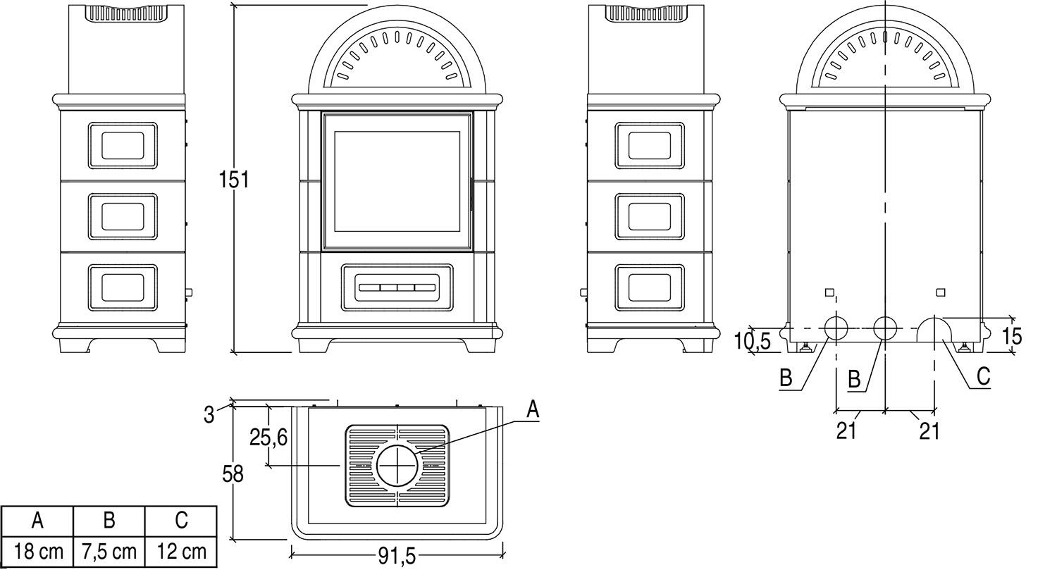 Высота, см 151 Ширина, см 91,5 Глубина, см 58 Мощность, кВт 5,3 - 11 Форма стекла Прямое Материал Сталь+Чугун+Керамика Диаметр дымохода, мм 180 Вес, кг 312 Духовка Нет -