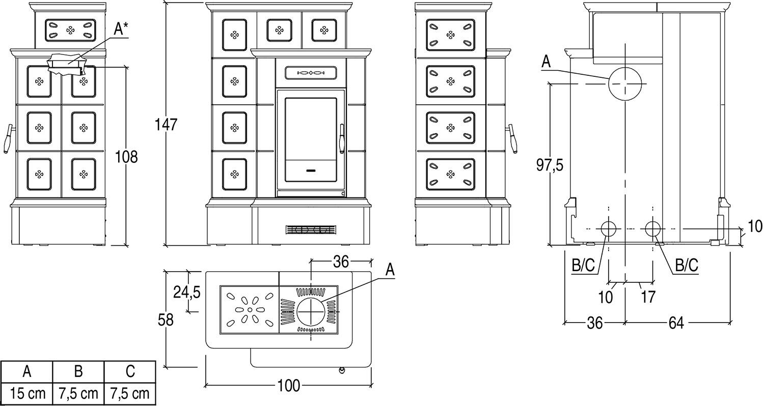 Высота, см 146,7 Ширина, см 100 Глубина, см 58 Мощность, кВт 5,5 - 11 Форма стекла Прямое Материал Сталь+Чугун+Керамика Диаметр дымохода, мм 150 Вес, кг 327 Духовка Нет -